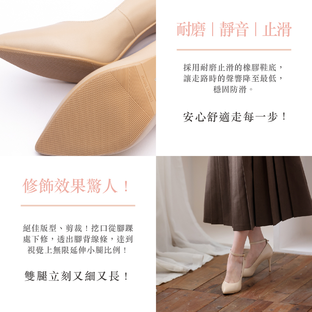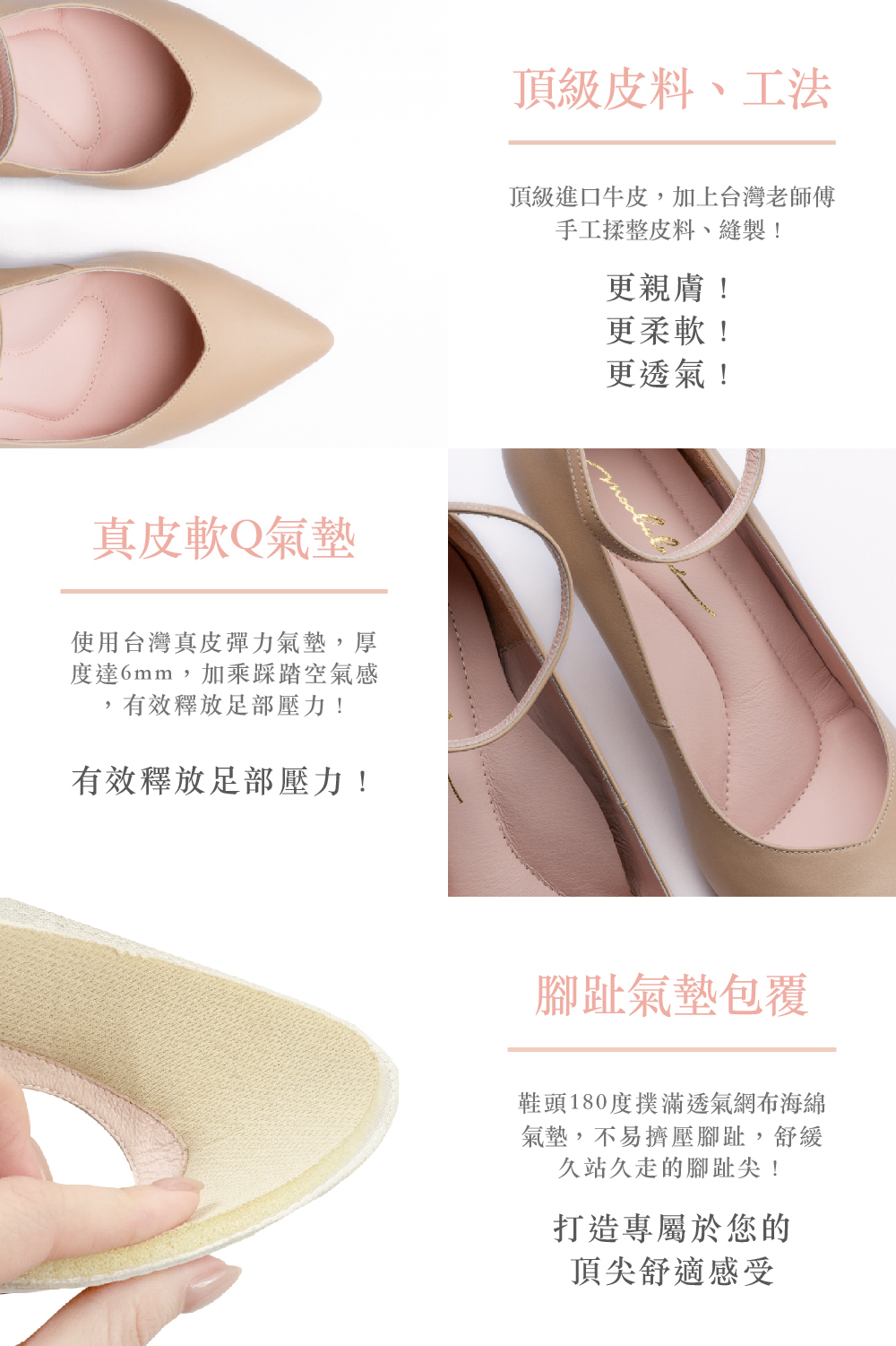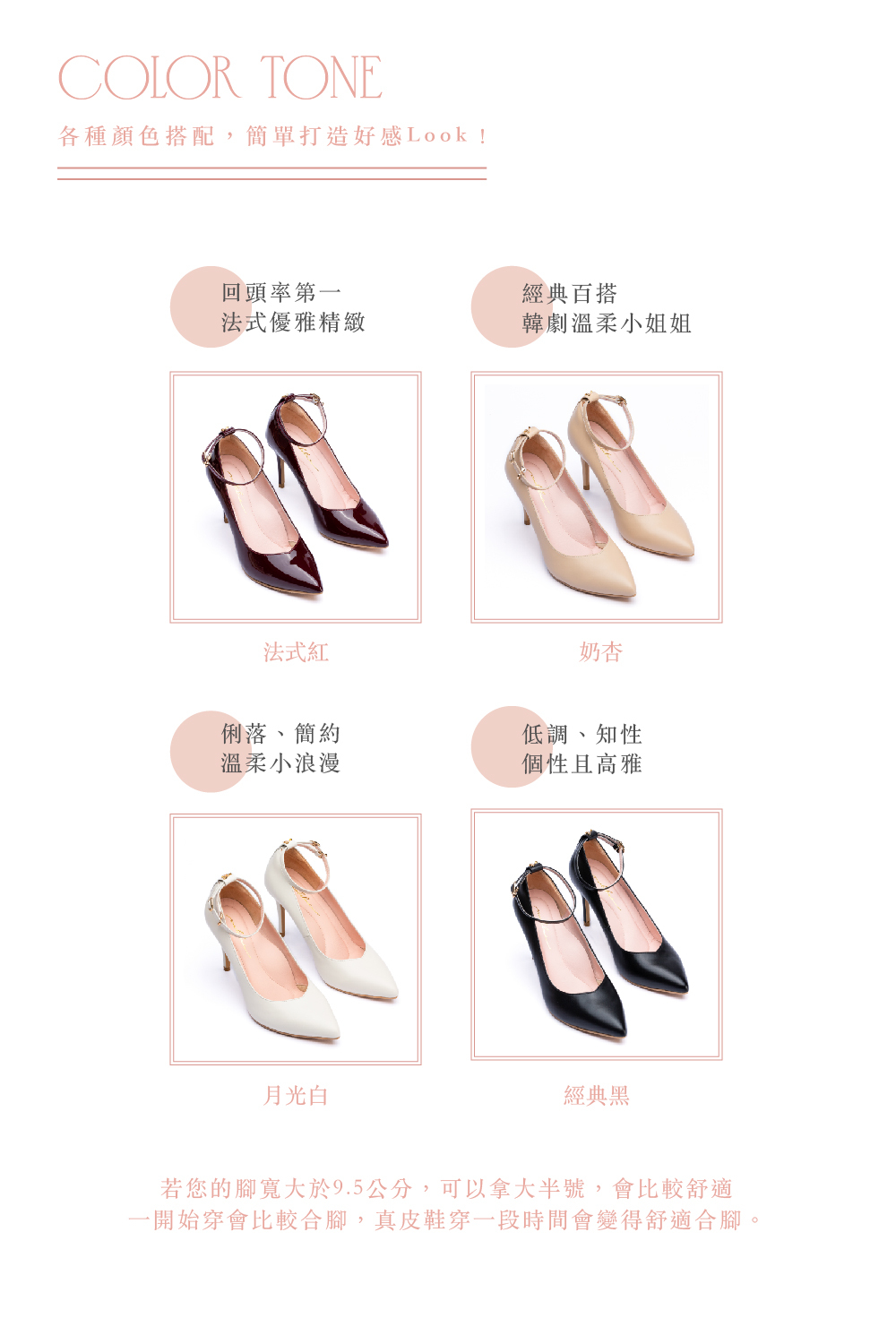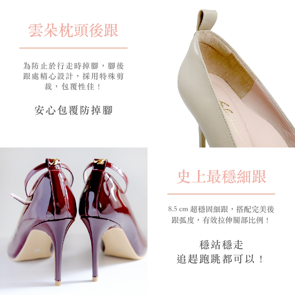革命性跟鞋👠木子史上最高超穩的8.5公分細高跟鞋,讓美麗不再等於痛苦!6mm減壓彈力真皮「沙發氣墊」,包腳性極強,耐受力穩固,讓雙腳行走省力如踏雲端,長時間穿也不累腳。瑪莉珍踝帶可拆卸,一筆預算兩種穿法。
