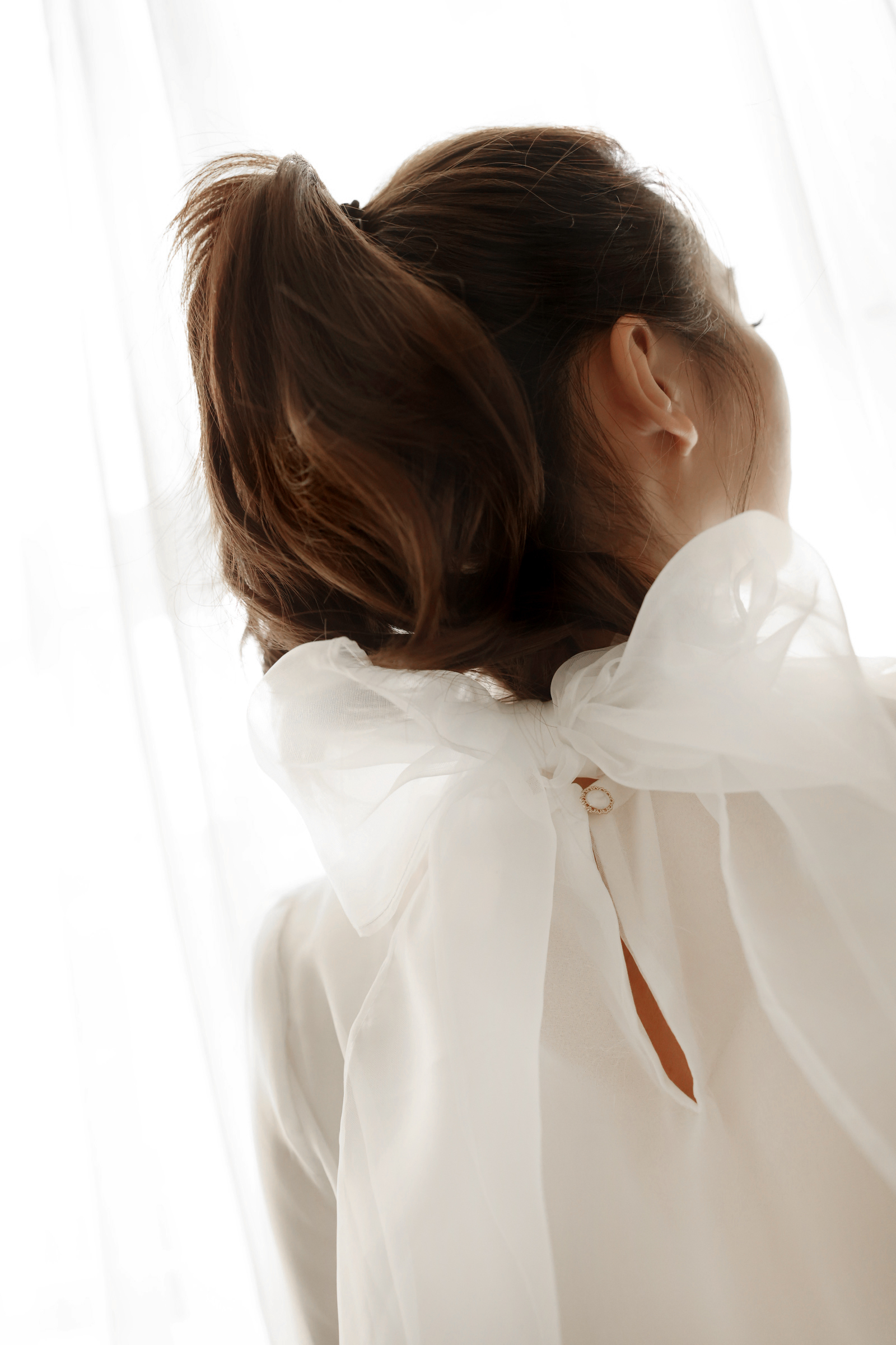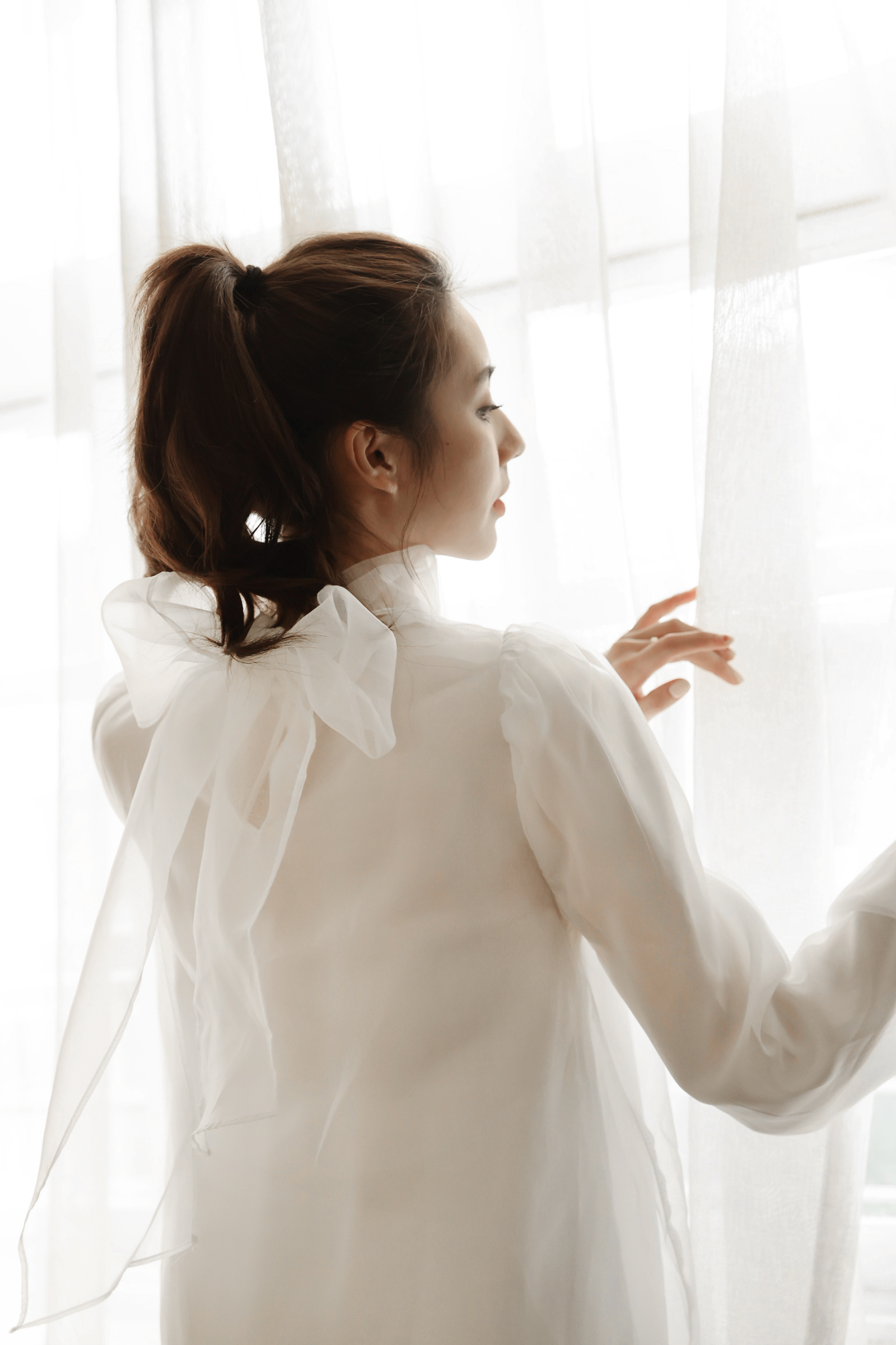 浪漫歐風蝴蝶結絲紗,可綁在後面,亦可綁在側邊或正面,化身優雅絲巾,為整體造型做浪漫點綴。頂級絲紗材質,內有襯布,共有白、粉、黑三色可選擇。