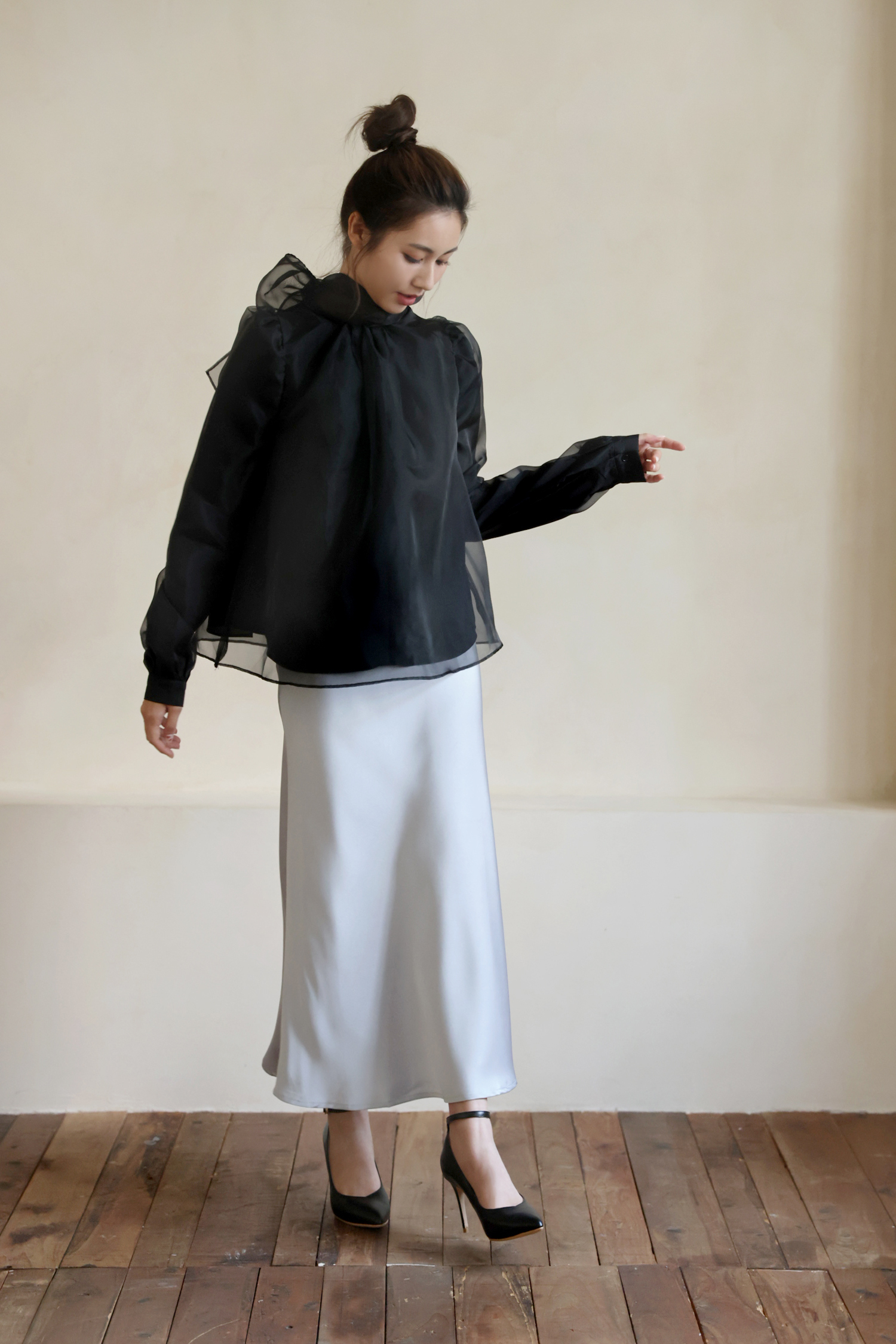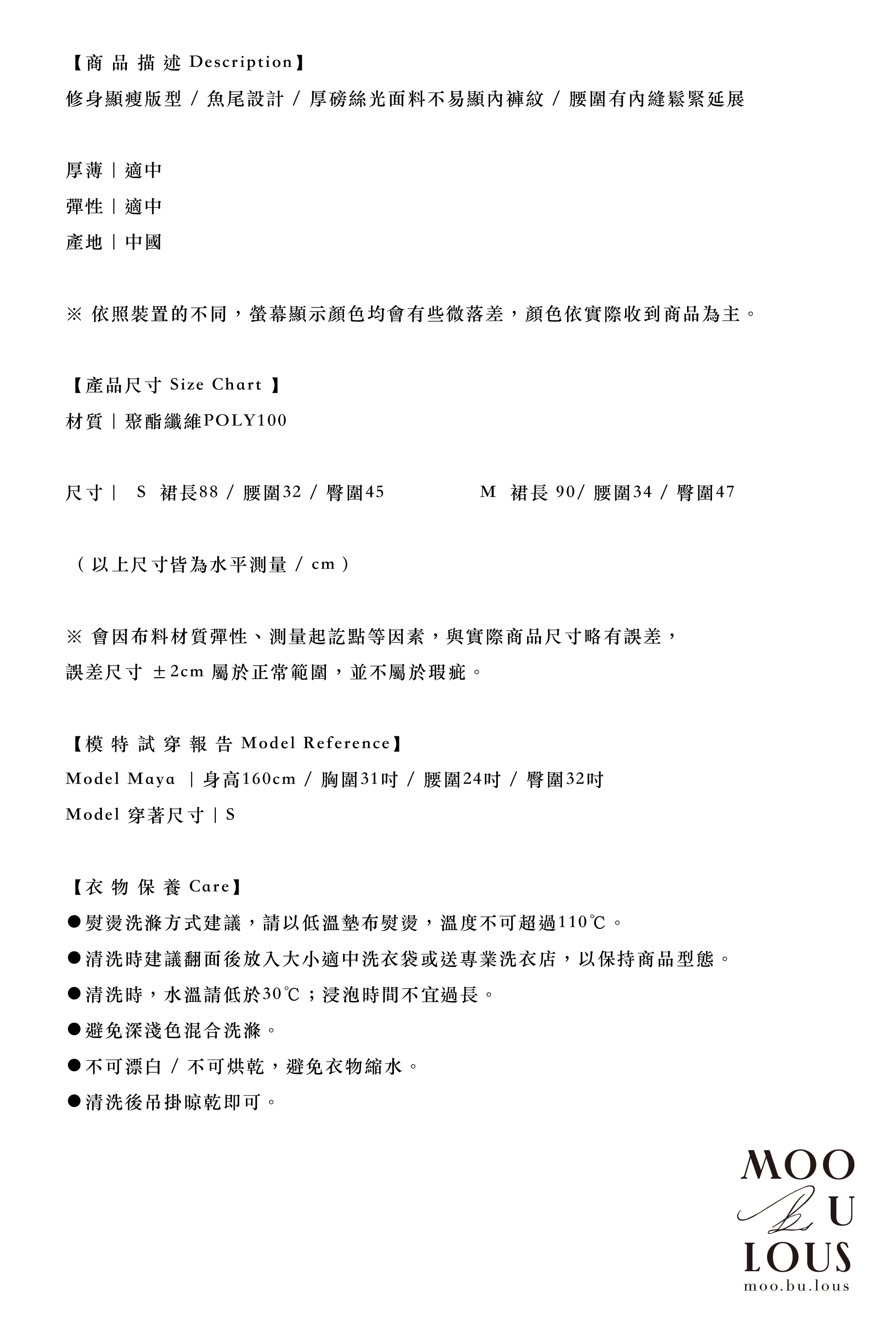 不同於快時尚透薄布料所製作的絲光裙,往往軟薄無力,吸貼身形顯得大腹便便,甚至薄到透光顯底褲。moobulous木子以厚磅頂級布料特製,搖墜飄逸的同時亦有堅挺版型,腰臀比例顯瘦修身,裙擺飄曳生姿,絲光緞布在陽光底下更自帶低奢耀眼的折射光采,亦有厚磅彈力鬆緊帶的設計,腰圍尺寸更彈性。