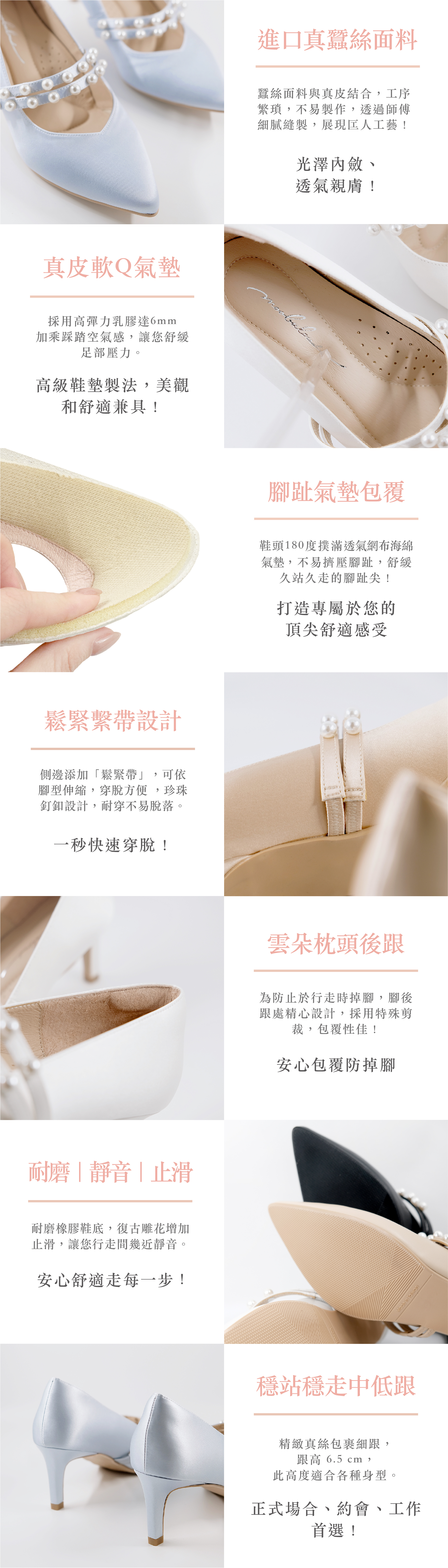 婚禮跟生活都不該妥協。婚鞋不該為了美遷就功能,買鞋也不該只為了滿足婚禮短暫精彩。真絲赫本小珍珠跟鞋,採用真蠶絲布鞋面,而非仿絲,對製作過程極為講究,為moobulous匠藝經典之作。不只真絲鞋面設計精美,全底氣墊、雲朵後跟、腳趾氣墊360度呵護雙腳,平時穿著上班也能在舒適中找到屬於妳的優雅。
