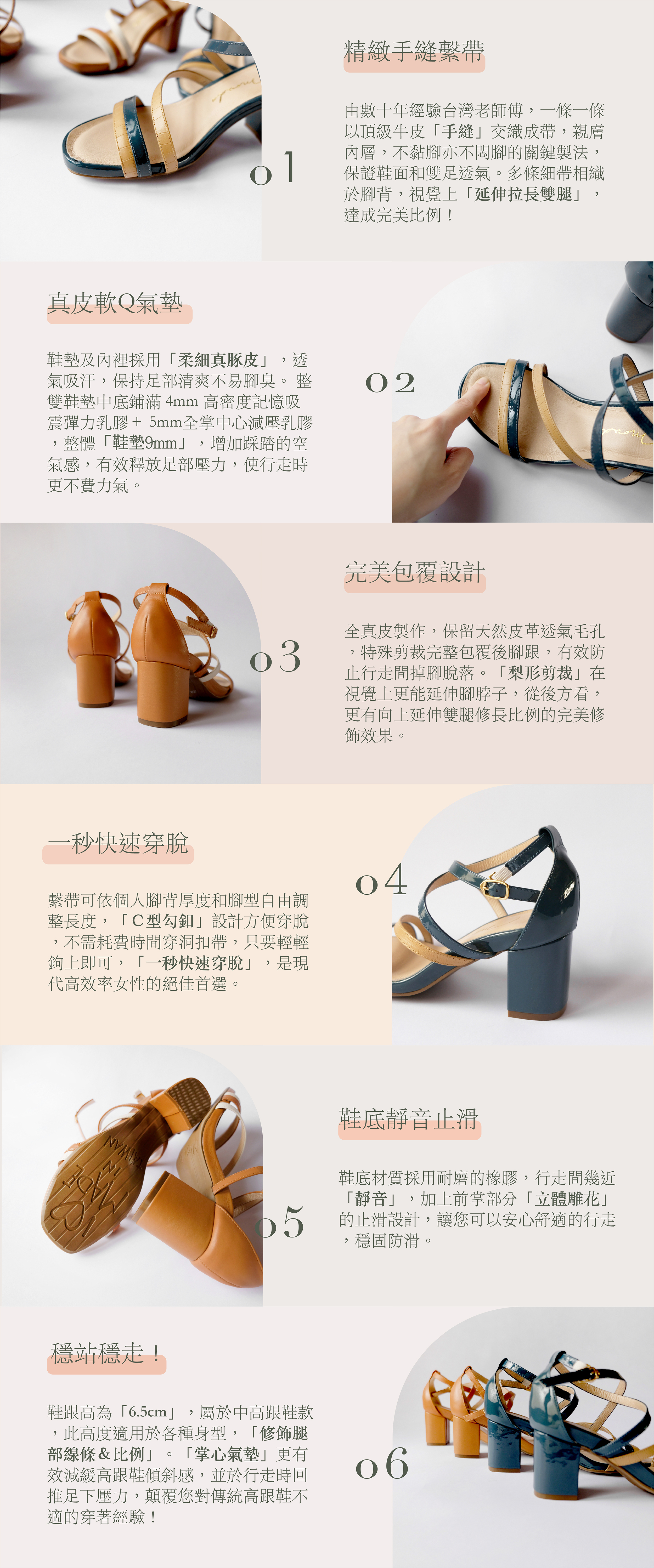 由數十年經驗台灣老師傅,一條一條以頂級牛皮手縫交織而成,在親膚內層保留皮革原始面及透氣毛孔,是炎炎夏日保證鞋面和雙足透氣,皮帶不黏腳亦不悶腳的關鍵製法。多條細帶相織於腳背,視覺上更達成足背修長效果,延伸拉長雙腿完美比例。