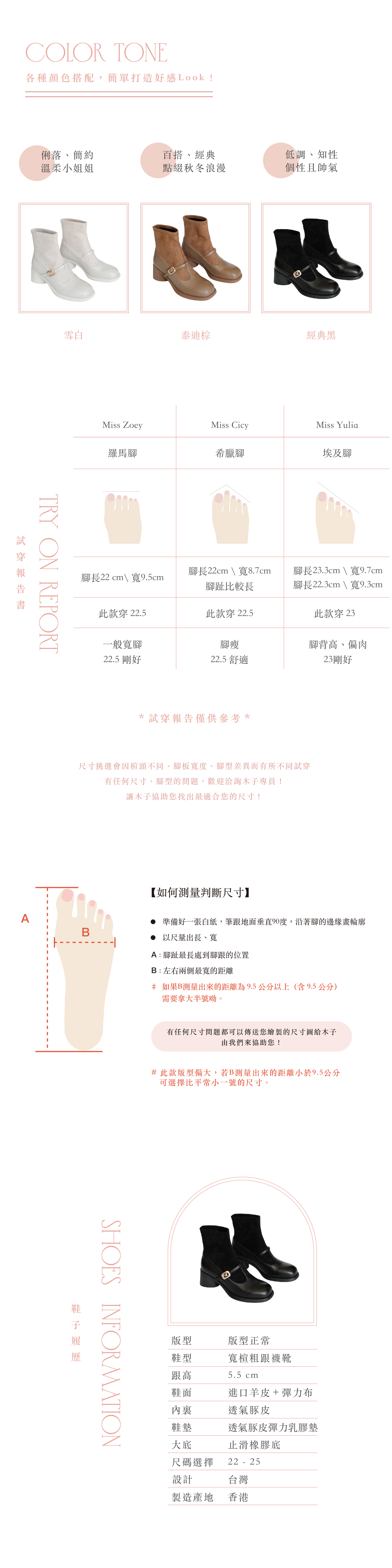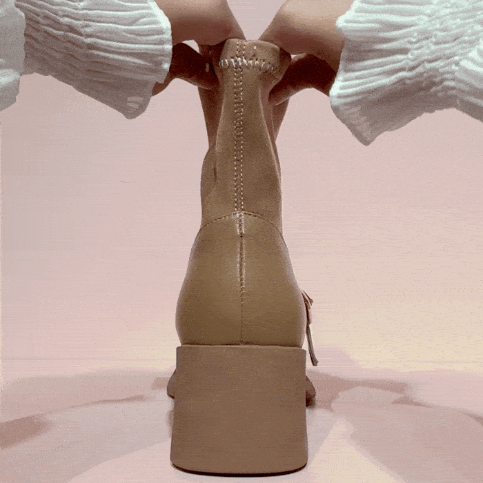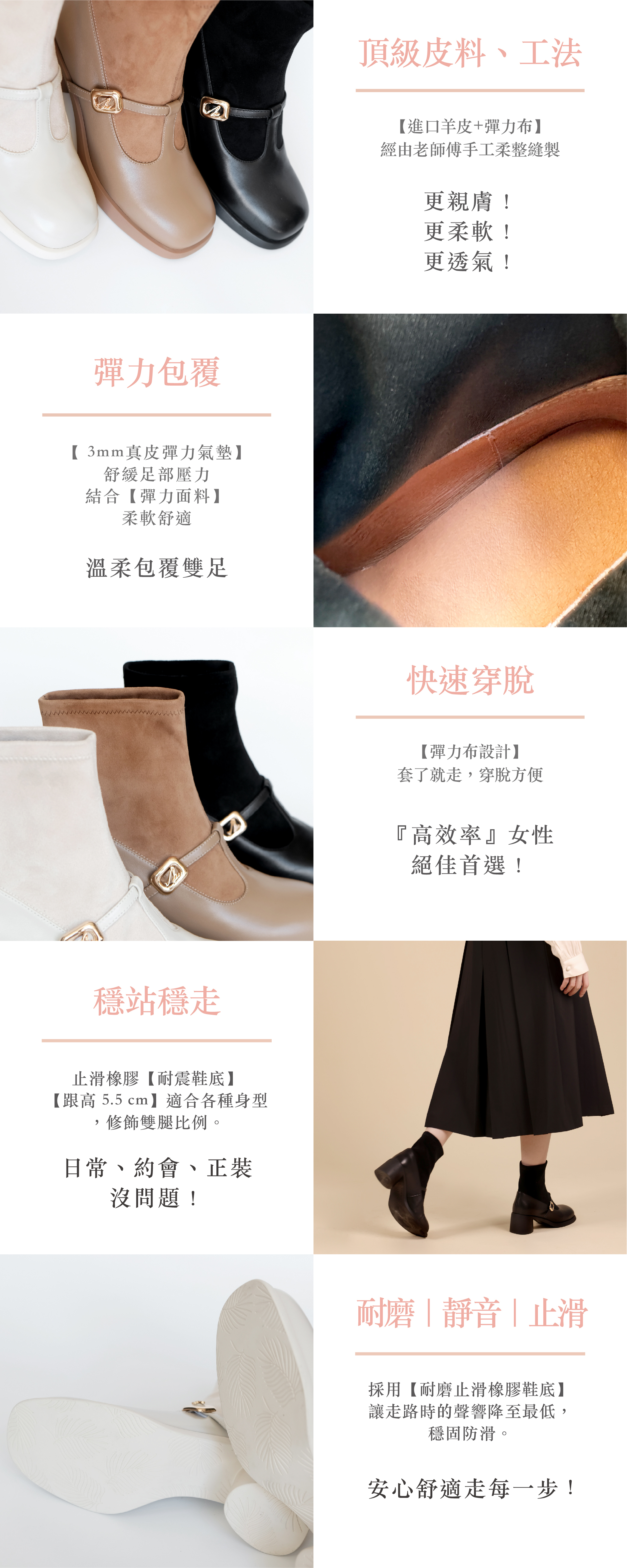 隨性跟優雅也能共存,打造妳的自在生活美學。「拼接絨布襪靴」採用進口皮革與彈力布巧妙結合,經老師傅細膩揉整與縫製,打造出高質感的柔軟包覆感。3mm真皮彈力氣墊讓每一步都輕盈舒適,猶如行走在雲端,帶來悠然自在的穿著體驗。彈力布襪靴設計讓穿脫更加隨性自然,套上即走,輕鬆融入日常步調。5.5cm粗跟穩固而修身,搭配止滑耐震鞋底,無論日常通勤或閒適出遊,都能陪伴妳隨性出發,展現自在魅力。