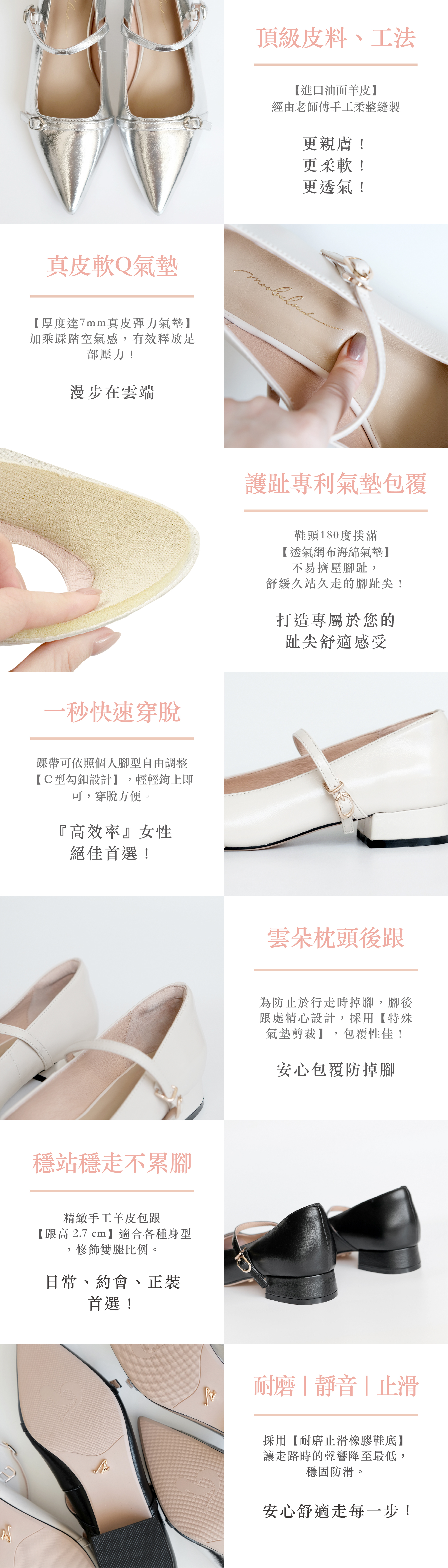 都會與優雅完美相融,幹練無須言說,用俐落步伐表現。「雙帶尖頭平底瑪莉珍」選用進口油面羊皮,由老師傅精心揉整與縫製,展現極致質感。內置7mm真皮彈力氣墊,每一步都如同踩在雲端般輕盈舒適,搭配鞋頭的護指透氣網布氣墊,即使是尖頭設計也不壓迫腳趾。雲朵枕頭後跟為您提供360度舒適支撐,讓雙足長時間穿著無負擔。C型釦勾雙帶設計,讓穿脫輕鬆自在,是都會俐落美人的優雅選擇。