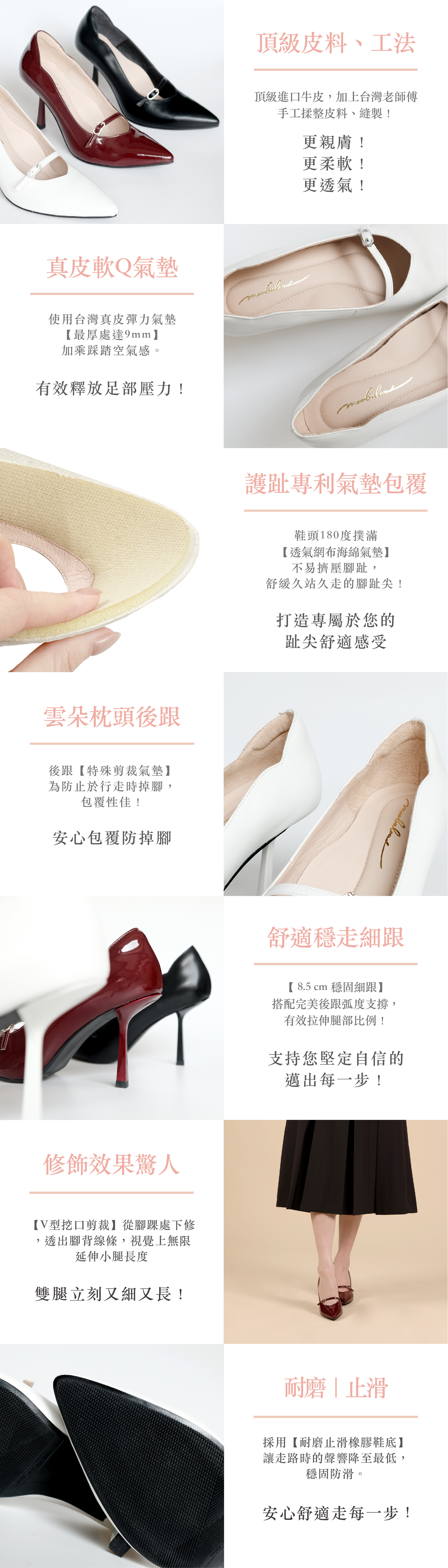「8.5cm小鑽細方根真皮高跟鞋」顛覆了高跟鞋帶來的傳統不適感,結合美觀與舒適性。革命性8.5公分細高跟設計搭配特製方柱型鞋根,使行走更穩固、受力均衡,即使長時間穿著也不累腳。內置9mm減壓彈力真皮「沙發氣墊」,包裹性強,行走時如同踩在雲端般輕盈。水鑽鞋帶設計延伸腳背面積,修飾腿部線條,讓您在各種場合中輕鬆展現高挑優雅的氣質。